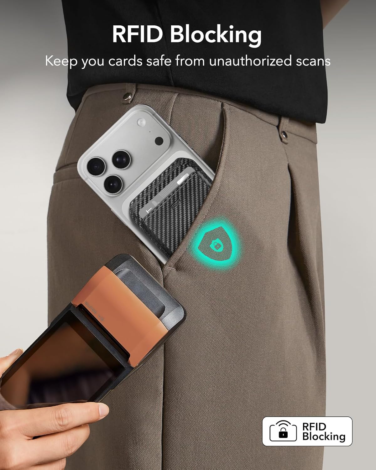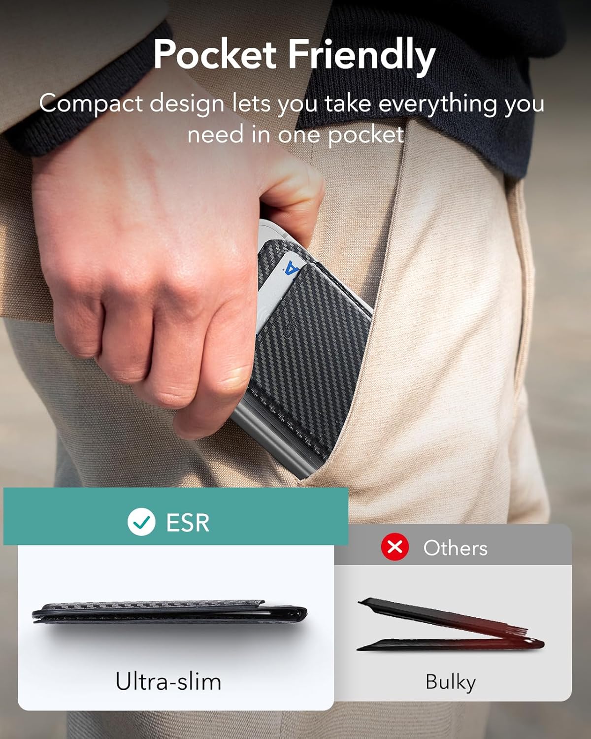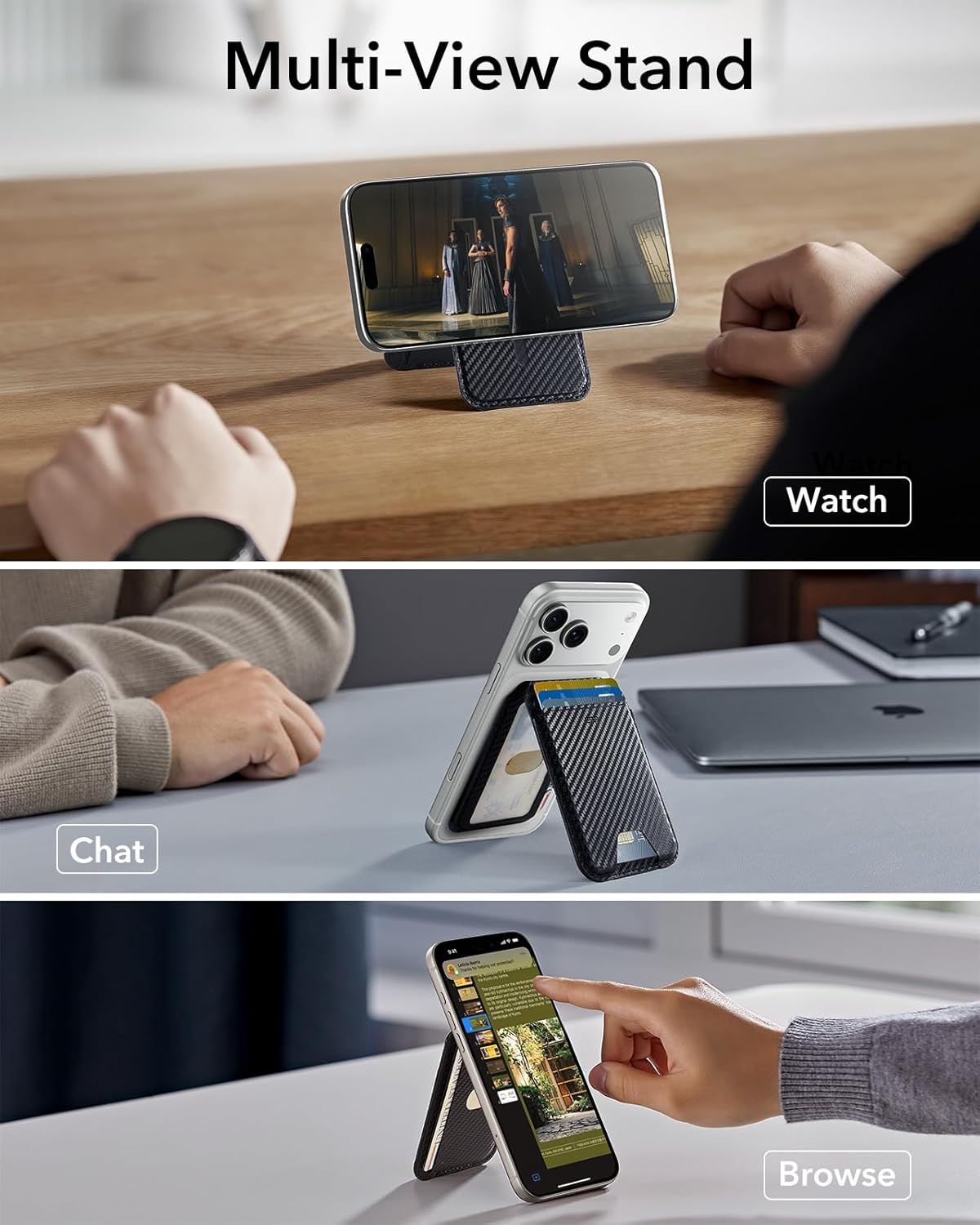 ESR HaloLock vegan deriden cüzdan standı, MagSafe Wallet ayarlanabilir stand, iPhone 15/15 Plus/15 Pro/15 Pro Max & 14/13/12 serisi uyumlu, 13/12 mini ile uyumlu değildir, siyah karbon fiber